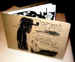Whew, this one's another toughie. This is an 11" x 15" handmade narrative portfolio. Limited to 500 copies, (hand?) printed on heavy flat white stock, with hand-scored cardboard covers, Dead Ringers is a graphic meditation on death and personal mortality that employs stasis as its central metaphor. Learn more, here.