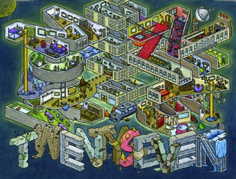 This time around we have a16-page tabloid newspaper comic book filled with further far out fables featuring Cassandra -- aka Castle -- cavorting with chaos. Santoro and Rugg employ the large (22" x 17", when opened) "canvas" of the tabloid format to excellent effect, creating a feast for the eyes with finely rendered dramatic imagery that ranges from psychedlicized fast food bathroom interiors to landscapes of the rolling hills of (what appears to be) western PA, all in the service of a tale of temporal displacement that demonstrates that the past is still here, all around us, and that travelling through time is a simple matter of opening a door or two. There may be some side effects, however...