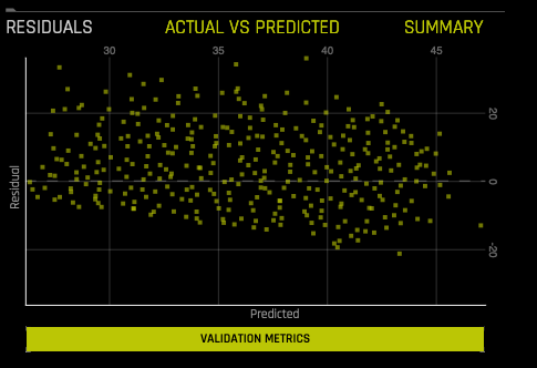 Residuals: Residuals 는 관측된 응답 및 모델에 의해 예측된 응답 사이의 차이입니다. 잔차의 모든 패턴은 부적절한 모델 또는 outliers와 같은 데이터의 불규칙성의 증거이며, 모델의 개선 방법을 제안합니다. 해당 차트는 검증 또는 테스트 데이터에 대한 잔차(실제 예측) 및 예측값을 나타냅니다. 이 그림은 모든 outliers를 유지합니다. 완벽한 모델의 잔차는 0입니다.