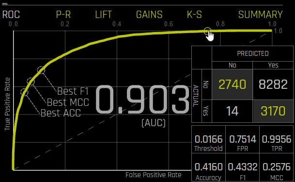 ROC 곡선의 한 포인트 위로 마우스를 커서를 가져가면, 해당 포인트에 대한 참 음성, 거짓 양성, 거짓 음성, 참 양성, 임계값, FPR, TPR, accuracy, F1 및 MCC 값을 혼동 행렬 양식으로 확인할 수 있습니다.