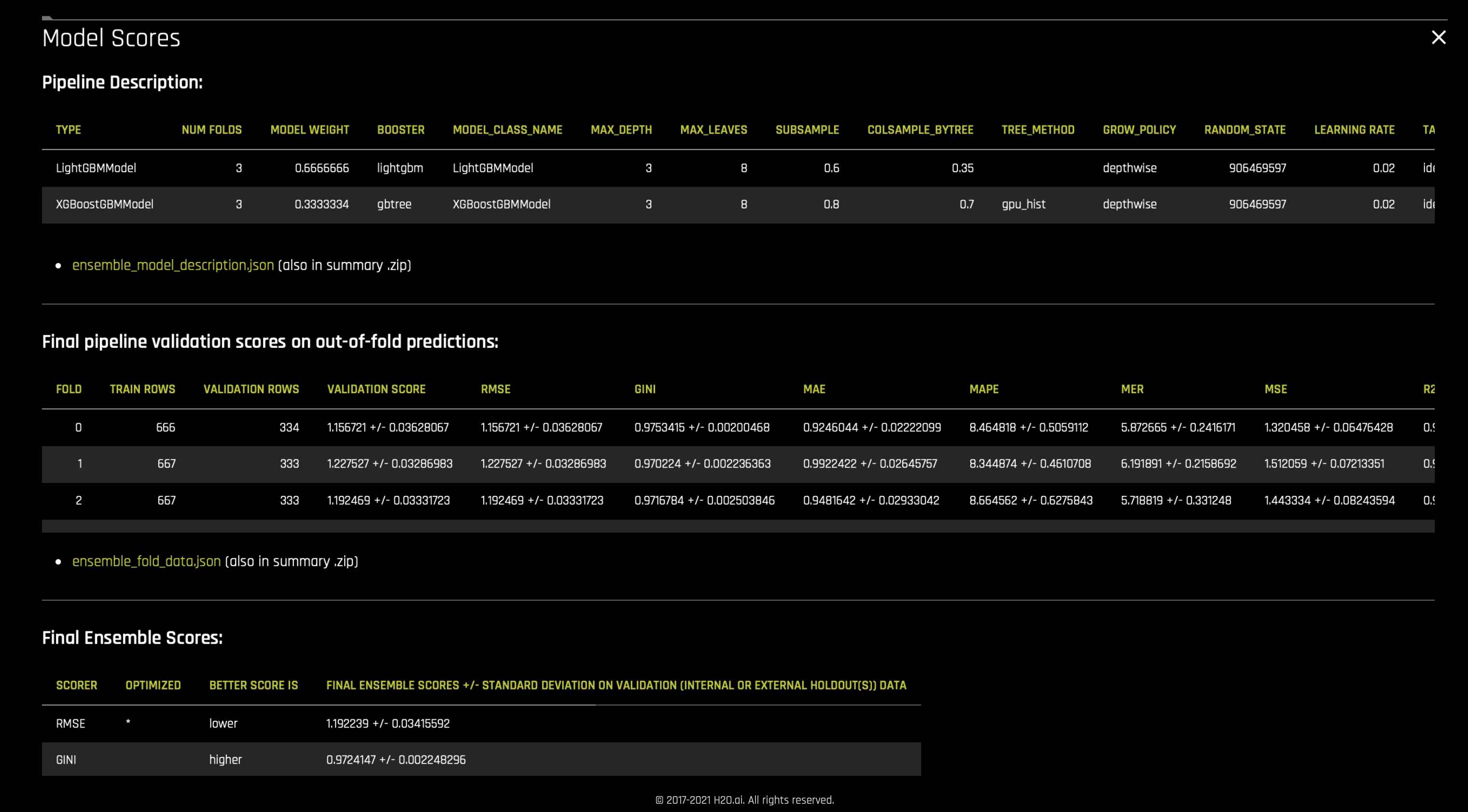 在第 17 次迭代中,对最终 集成 模型执行三折交叉验证,对所用特征执行一些检查,并创建预测和 python 及 mojo 评分管道 。收集了 工件 的日志和摘要。