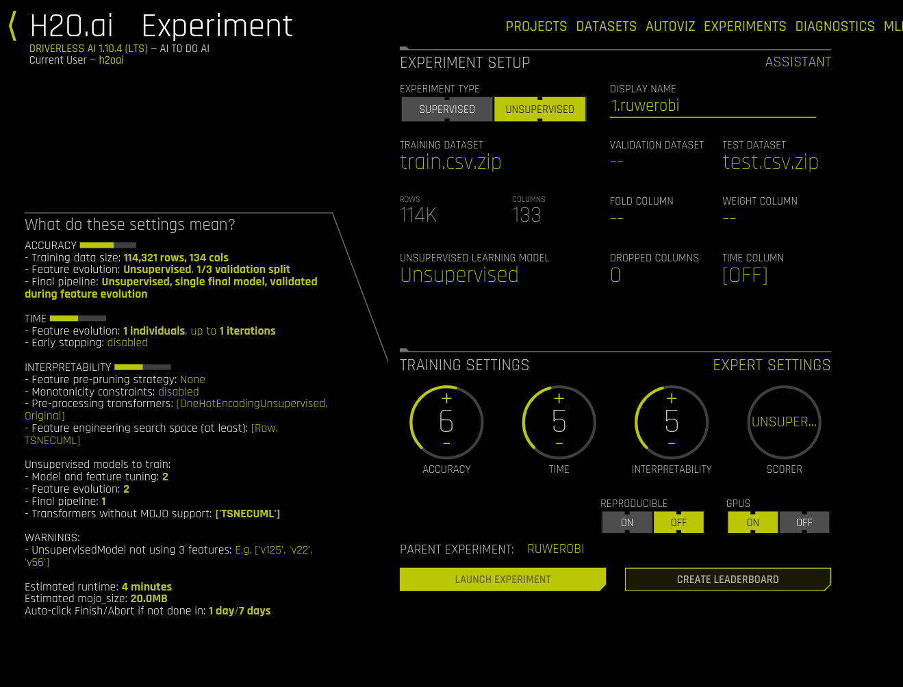 You can control unsupervised experiments by selecting specific pretransformers and transformers. Pretransformers are equivalent to the first layer of a pipeline, and transformers are equivalent to the second layer of a pipeline. To specify pretransformers and transformers, use the Expert Settings window of an experiment. For more information, see Understanding DAI configuration options.