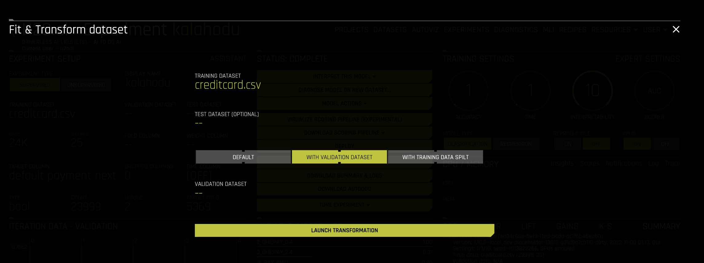 On the completed experiment page for the original dataset, click Model Actions -> Fit & Transform Dataset.