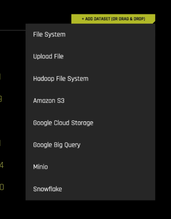 Click the Add Dataset (or Drag and Drop) button to upload or add a dataset. Note that if Driverless AI was started with data connectors enabled for HDFS, S3, Google Cloud Storage, Google Big Query, Minio, and/or Snowflake, then a dropdown will appear allowing you to specify where to begin browsing for the dataset. Refer to Enabling Data Connectors for more information.