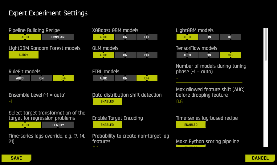 This specifies the relative time for completing the experiment (i.e., higher settings take longer). Early stopping will take place if the experiment doesn’t improve the score for the specified amount of iterations.
