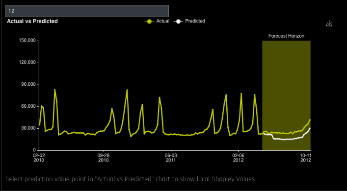 - Click on a prediction point in the plot (white line) to view Shapley values for that prediction point. The Shapley values plot can also be downloaded to your local machine.