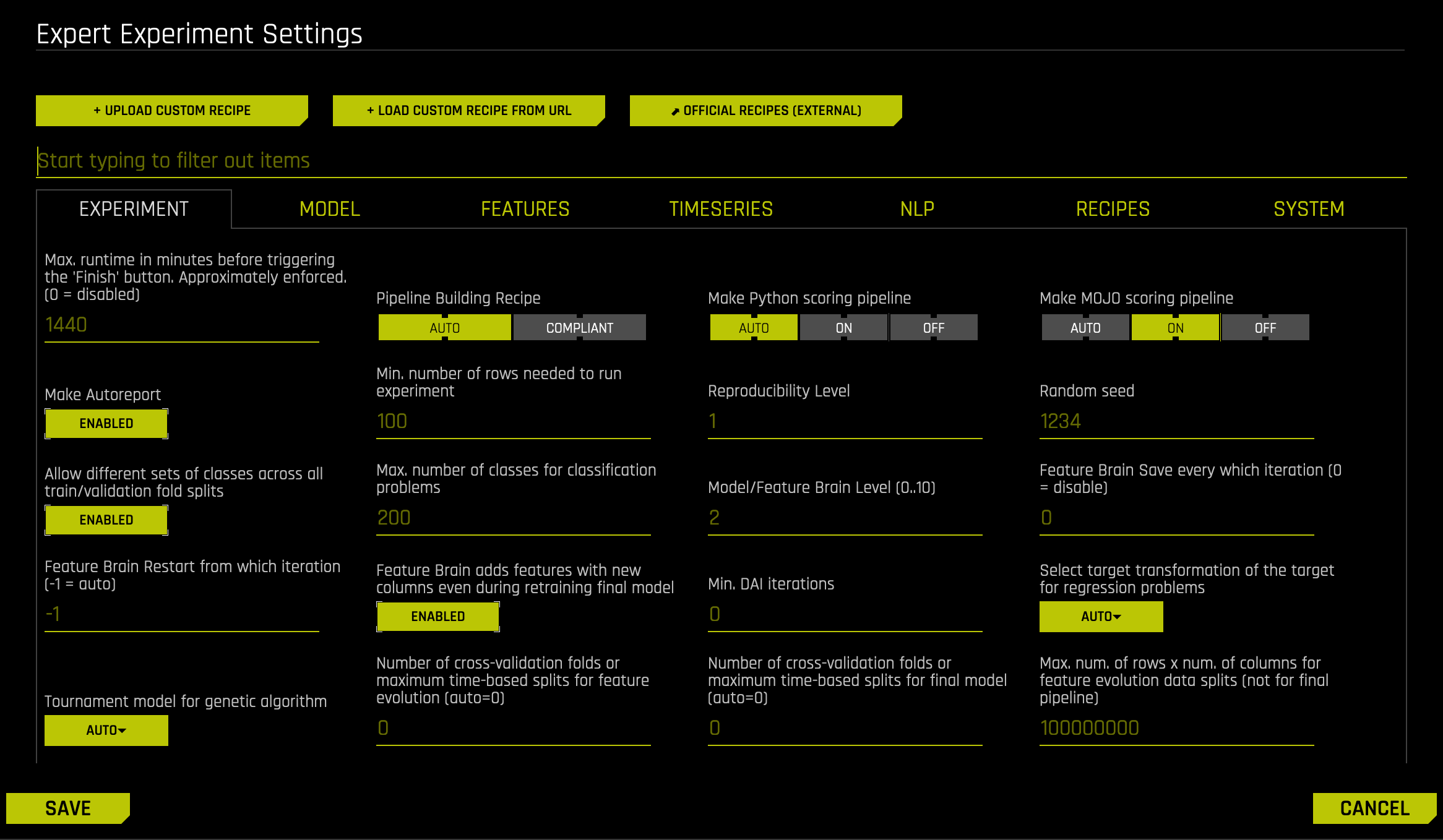 Note about Feature Brain Level: By default, the feature brain pulls in any better model regardless of the features even if the new model disabled those features. For full control over features pulled in via changes in these Expert Settings, users should set the Feature Brain Level option to 0.