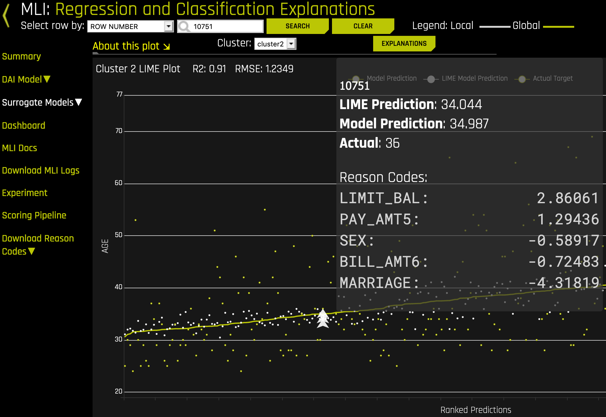 Local Reason Codes by Row Number: To view local reason codes for a specific row, select a point on the graph or type a value in the Row Number field.