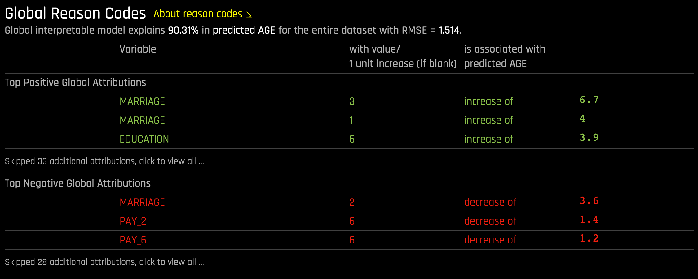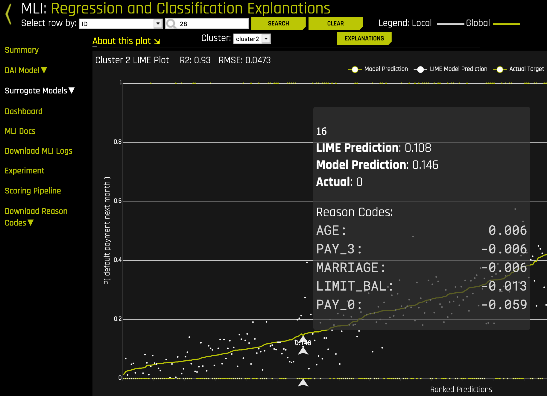 The UI allows you to view global, cluster-specific, and local reason codes. You can also export the explanations to CSV.