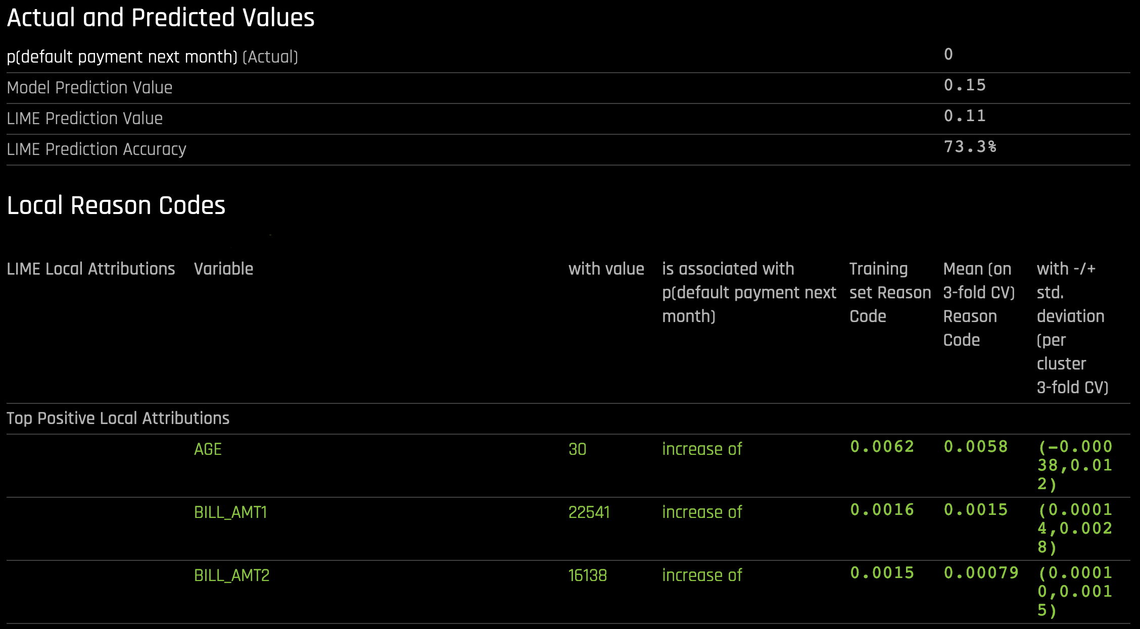 Each local contribution is positive and thus contributes positively to the Driverless AI model’s prediction of 0.85 for H2OAI_predicted_default. By taking into consideration the value of each contribution, reason codes for the Driverless AI decision can be derived. debt_to_income_ratio and credit_score would be the two largest negative reason codes, followed by savings_acct_balance.