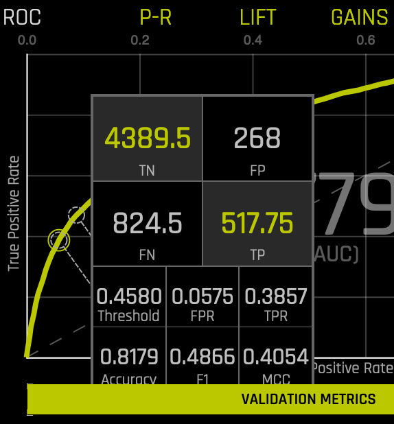 Hover over a point in the ROC curve to see the True Negative, False Positive, False Negative, True Positive, Threshold, FPR, TPR, Accuracy, F1, and MCC values for that point in the form of a confusion matrix.