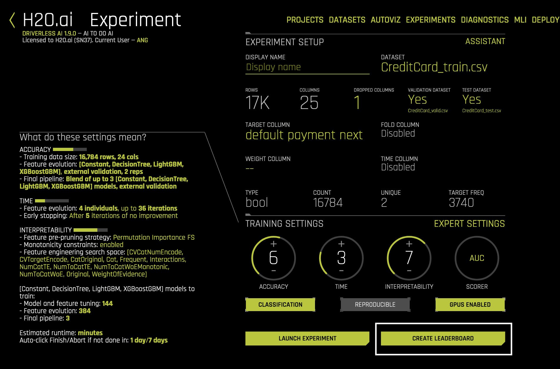 • Unlike in regular experiments, the leaderboard will only build models using the specified Accuracy/Time/Interpretability settings.