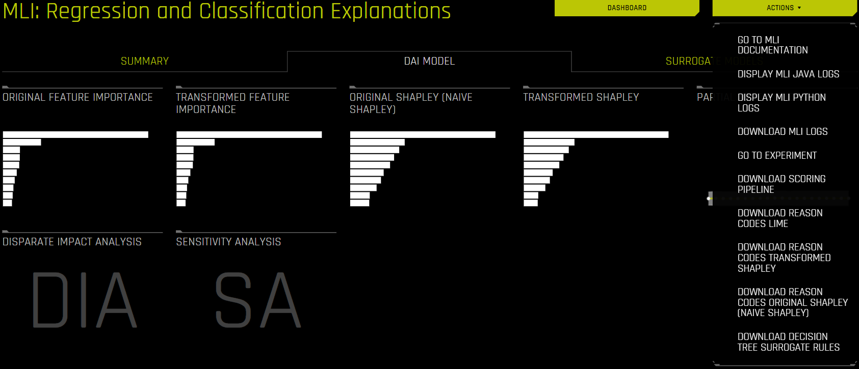 Driverless AI lets you view and download Python and/or Java logs while MLI is running. To download these logs, navigate to the MLI page for an experiment that is being interpreted and click the Actions button. Note that these logs are not available for time-series experiments.