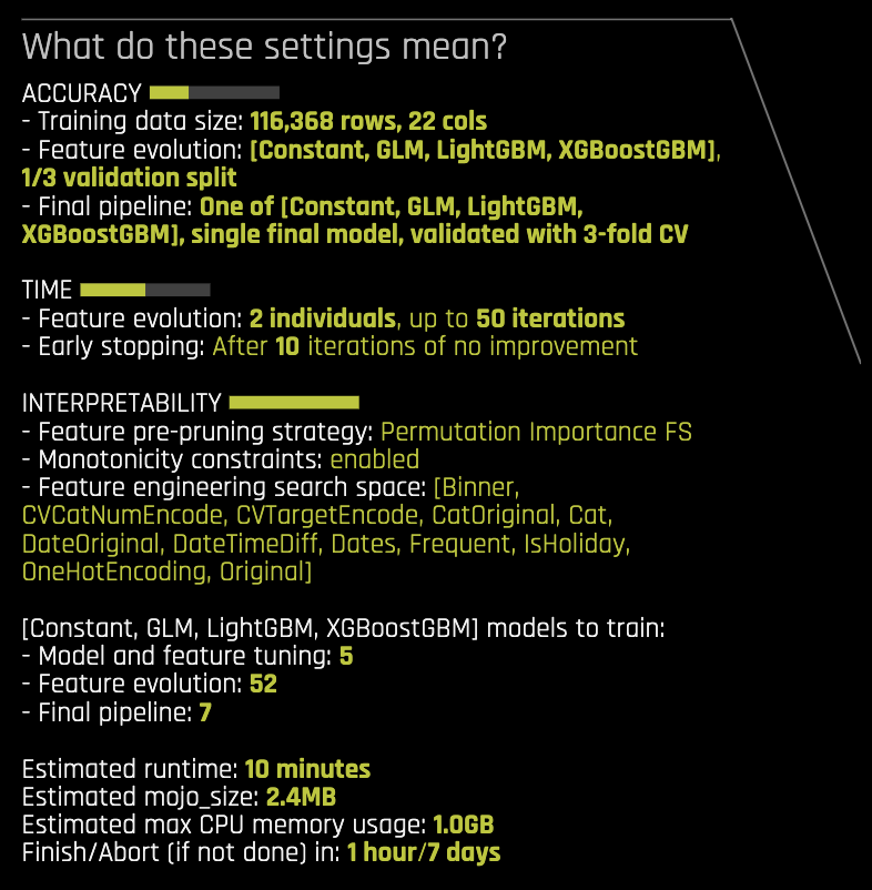 The experiment preview describes what the Accuracy, Time, and Interpretability settings mean for your specific experiment. This preview automatically updates when any of the experiment’s settings change (including the knobs).