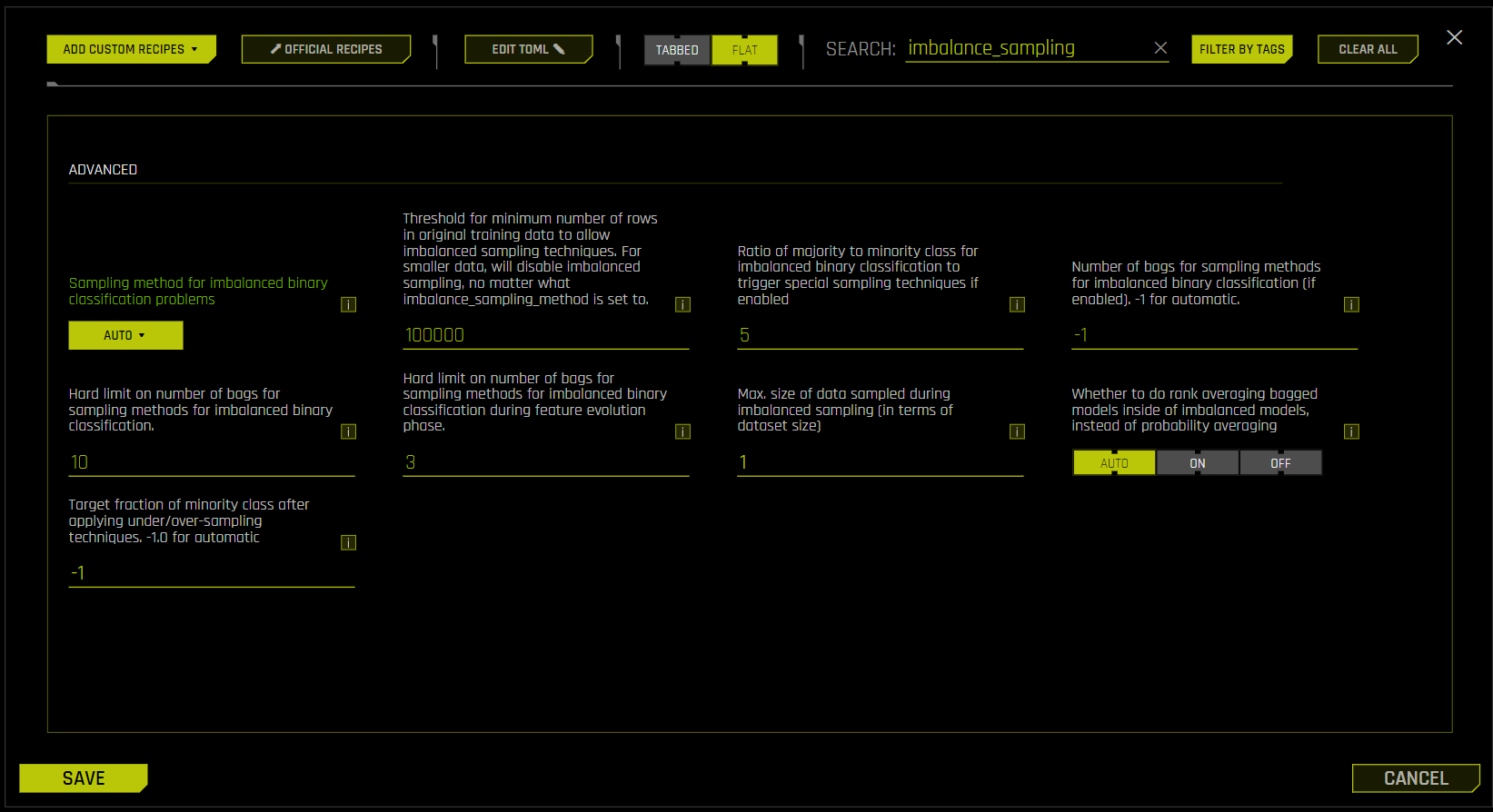 In the Expert Settings window, enter imbalance_sampling in the search field to filter the displayed settings.