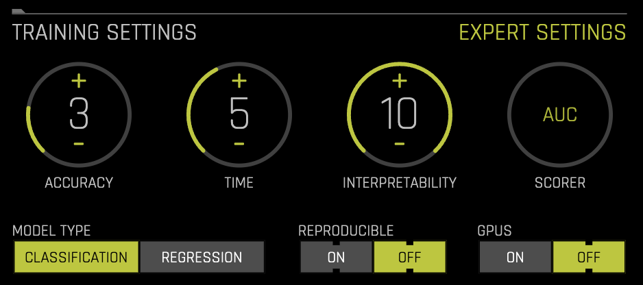 The experiment preview describes what the Accuracy, Time, and Interpretability settings mean for your specific experiment. This preview automatically updates when any of the experiment’s settings change (including the knobs).