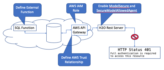The H2O REST Server only accepts calls from the AWS Gateway endpoint. When the parameter -DSecureModelAllowAgent=”AmazonAPIGateway.*|snowflake.*” is added to the command line, it’s even possible to further limit this to a specific AWS function.