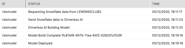 The Snowflake external function feature lets you build Driverless AI models from a Snowflake worksheet. When requesting Driverless AI to build a model from a worksheet, the build status is updated in a table called MODELBUILD so that the build can be monitored.