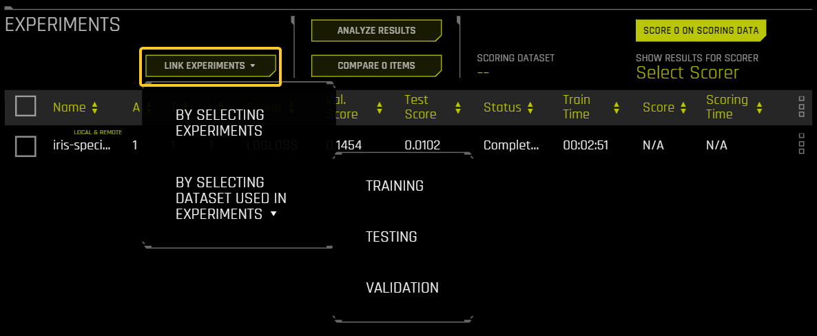 From the Project page, you can link datasets and/or experiments, run new experiments, and score experiments on a scoring dataset. When you link an existing experiment to a Project, the datasets used for the experiment are automatically linked to the project (if not already linked).