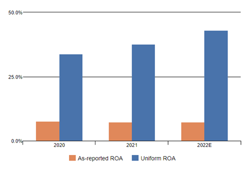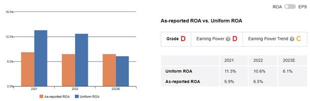 As a $400 billion retailer, the company struggles to generate strong returns sustainably. Its Uniform ROA has remained around 10% for the past three years, below corporate averages.