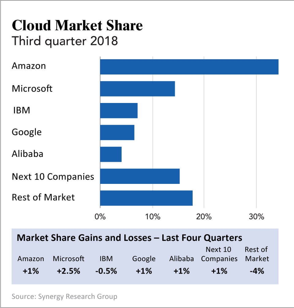 Now, AWS controls 34% of the cloud services market. Microsoft is a distant No. 2.