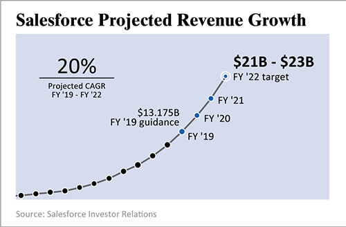 Salesforce is projecting a 20% compound annual growth rate through at least 2022. Others are predicting a $29.7 billion market by 2022.
