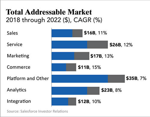 Salesforce’s products address large and growing markets. The following are the company’s top markets, their sizes and their projected compound annual growth rates through 2022.