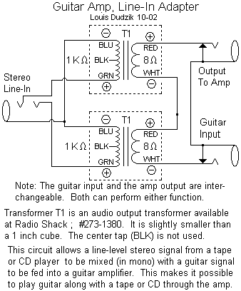 Designs for a converter which allows a stereo audio signal and a guitar signal to be fed into a guitar amp simultaneously.