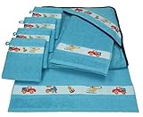 - das flauschige Kinder Set in blau mit Motivbordüre Fahrzeuge besteht aus einem Kapuzenbadeuch 90x90cm zwei Handtüchern 50x70cm und vier Waschhandschuhen mit Kordelaufhängern 16x21cm - ein Muss für echte Jungs. Das Frottierset ist schadstoffgeprüft nach Öko Tex Standard 100