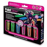 - This paint glow set includes 6 bright neon glow in the dark body paint! Yellow, orange, blue, red, pink & green
