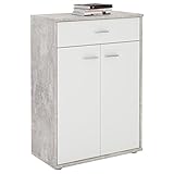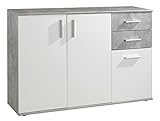 - Der Korpus ist in einem Dekor in Betonoptik foliert, die Schubladen- und Türfront in weiß