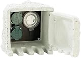 - 2 spritzwassergeschützte Schutzkontakt-Steckdosen,^mechanische Zeitschaltuhr^robustes Gehäuse aus Kunstharz in Steinoptik^Temperaturbereich: -15°C bis + 40°C^IP 44 (spritzwassergeschützt)