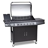 - 6 Hauptbrenner aus Edelstahl / 1 Seiten-Brenner / mit doppelwandiger Haube (innen aus Aluminium) - dieser BBQ-Grill ist TÜV-Rheinland zertifiziert - Zertifikatsnummer Q 60108840 - ideal für Ihren Balkon, die Terrasse oder zum Camping