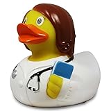 - gelbe Quietscheente mit weißem Kittel und Stethoskop