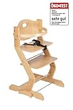 - Stabiler Hochstuhl aus Holz mit hoher Kippsicherheit durch spezielle Konstruktion. Abnehmbarer Sicherheitsbügel und Gurtsystem bieten zusätzlichen Schutz. Entwickelt und produziert nach aktuellsten Sicherheitsstandards nach DIN EN 14988-1+2:2006+A1:2012