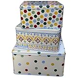 - Farbe: Große und kleine Dose mit mehrfarbigen Punkten, mittelgroße Dose mit Streifen