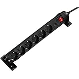 - Steckerleiste mit sechs Schutzkontaktsteckdosen: jede Steckdose einzeln schaltbar, zusätzlicher beleuchteter Hauptschalter zum Schalten der kompletten Leiste