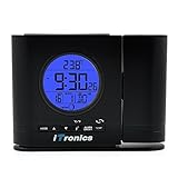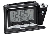 - Funkgesteuert oder manuell einstellbar, Anzeige von Uhrzeit, Datum, Wochentag, Temperatur & Mondzyklus; bei zusätzlichem Netzteil-Betrieb dauerhafte Uhrzeit-Projektion.