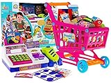 - Spielzeugkasse mit Schublade für Geld, Einkaufskorb und Zubehör für den Einkauf.