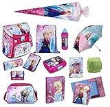 - Brotzeitdose Eisköngin aus Kunststoff; leicht zu Schließen und zu Öffnen; Abmessungen: ca. 17 cm breit x 5 cm hoch x 14 cm tief; Sportflasche Eiskönigin aus Kunststoff; wasserdicht verschließbar; Fassungsvermögen 425 ml; 1x Schul/Schreibset 5-tlg. (wird als 5 Teile gezählt) 1x Heftbox A4 1x Gummimappe A4 1x Regenschirm (Taschenschirm) 1x Regen-/Sicherheitshülle