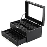 - Praktische Aufteilung - 2 Ebenen. Auf der ersten Ebene sind 12 Fächer für 12 Uhren, die von weichen Uhrenkissen gehalten werden. Die untere Schublade ist für Ringe, Ketten, Armbänder usw. geeignet. Ihre Schmuckstücke werden ordentlich und platzsparend aufbewahrt, und bleiben immer griffbereit