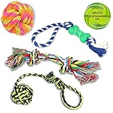 - ✅ VARIATIONSREICHES 4er SET: Bestehend aus Spieltau 33 cm - Ball mit Schnur ø 6 cm/37 cm - Knochen am Seil 34 cm - Hundeball ø 9 cm - Bunte Farbvielfalt.