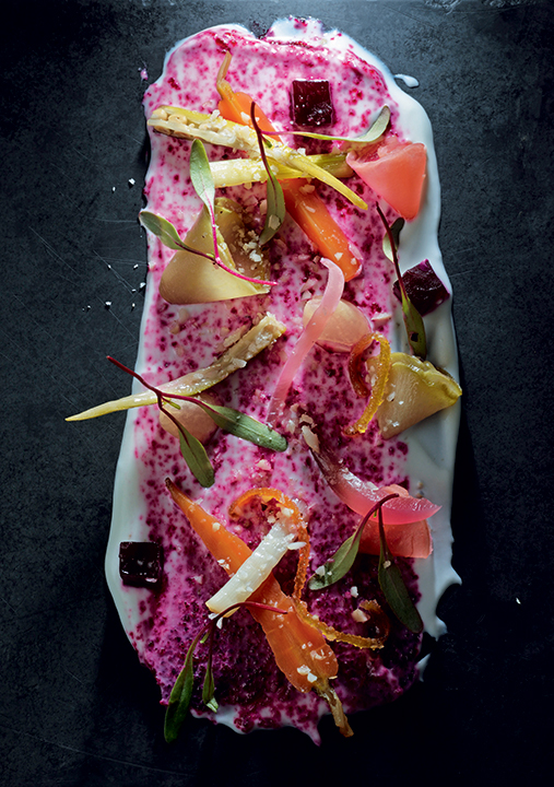 OUSADIA. Ricota de búfala, quiabo fermentado, picles de minilegumes no vinagre e mel, zest de laranja e castanha-do-pará. Criação do chef Thomas Troisgros
