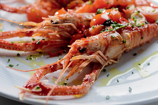 IRRESISTÍVEL. Lagostins frescos. Alguns ingredientes são criados em aquário e ficam à mostra no salão