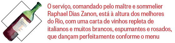 Osteria dell´Angolo Uma esquina italiana com menu clássico que passeia por várias regiões do país. Os antepastos são obrigatórios: uma seleção de petiscos como polenta ao gorgonzola, salada de frutos do mar com alho-poró, e de atum com feijão-branco e cebola-roxa, lasanha de berinjela. Entre os pratos, os com frutos do mar e peixes merecem destaque. Rua Paul Redfern, 36, Ipanema. Tel. 2259-3148. osteriadellangolo.com.br