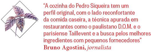 Puro Inaugurado neste ano, é a primeira casa do chef Pedro Siqueira, egresso do grupo Fasano. Uma das melhores novidades de 2015, continua renovando seu menu brasileiro e contemporâneo, com tempero autoral. Prove o pão com ovo à carbonara com barriga de porco. Rua Visconde de Carandaí, 43, Jardim Botânico. Tel. 3284-5377.purorestaurante.com.br