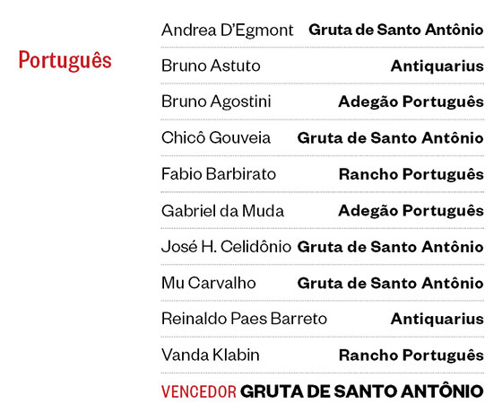 Antiquarius Desde 1977 prepara arroz de pato, bacalhau à lagareiro, alheiras, perna de cordeiro com feijão-branco e doces conventuais na mais famosa e badalada casa portuguesa do Brasil. Rua Aristides Espínola, 19, Leblon. Tel. 2294-1049.