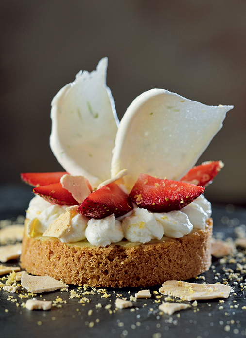 EXUBERÂNCIA. Torta de crémeux de graviola com chantilly mascarpone e morangos. Peça também o fondant de chocolate com praliné, um clássico