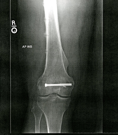 To the left is an x-ray of my leg as it has been since January, 2002. The bracket depicted above was attached to my right femur with numerous screws to stabilize it during the original recovery period. To the right is an x-ray of my leg today (literally, it was taken today, September 2, 2014). The one remaining screw was so deeply embedded that my surgeon couldn't remove it. He said that should knee replacement surgery become necessary, that's when it will go. In the meantime it's an interesting if inaccessible souvenir.