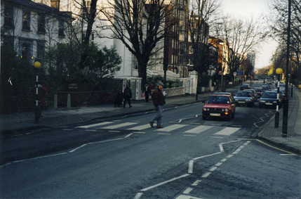 The Beatles walking tour covered many of the places I'd heard of and seen in photographs but of which I was unsure where to go to see: their early apartment buildings in town, recording studio offices, site of their ill-fated boutique The Fool, the site of their rooftop concert depicted in "Let It Be", etc. The last place we visited, one that required a relatively long ride on the London Tube (i.e., the subway) was the famous Abbey Road Studio, where they recorded almost all of their music. Here we could walk up to the studio's door, have our pictures taken and just see it. But of much greater interest to me was the famous, nearby Zebra Crossing (i.e., crosswalk) that was the scene of the photograph on the cover of one of their last, best and most influential recordings, "Abbey Road", released in the Fall of 1969. Here Ginnie took my photograph as I too strode across the Zebra Crossing, somewhat as they had done twenty seven years earlier. To the right are the two pictures, theirs and mine, taken at the same place.